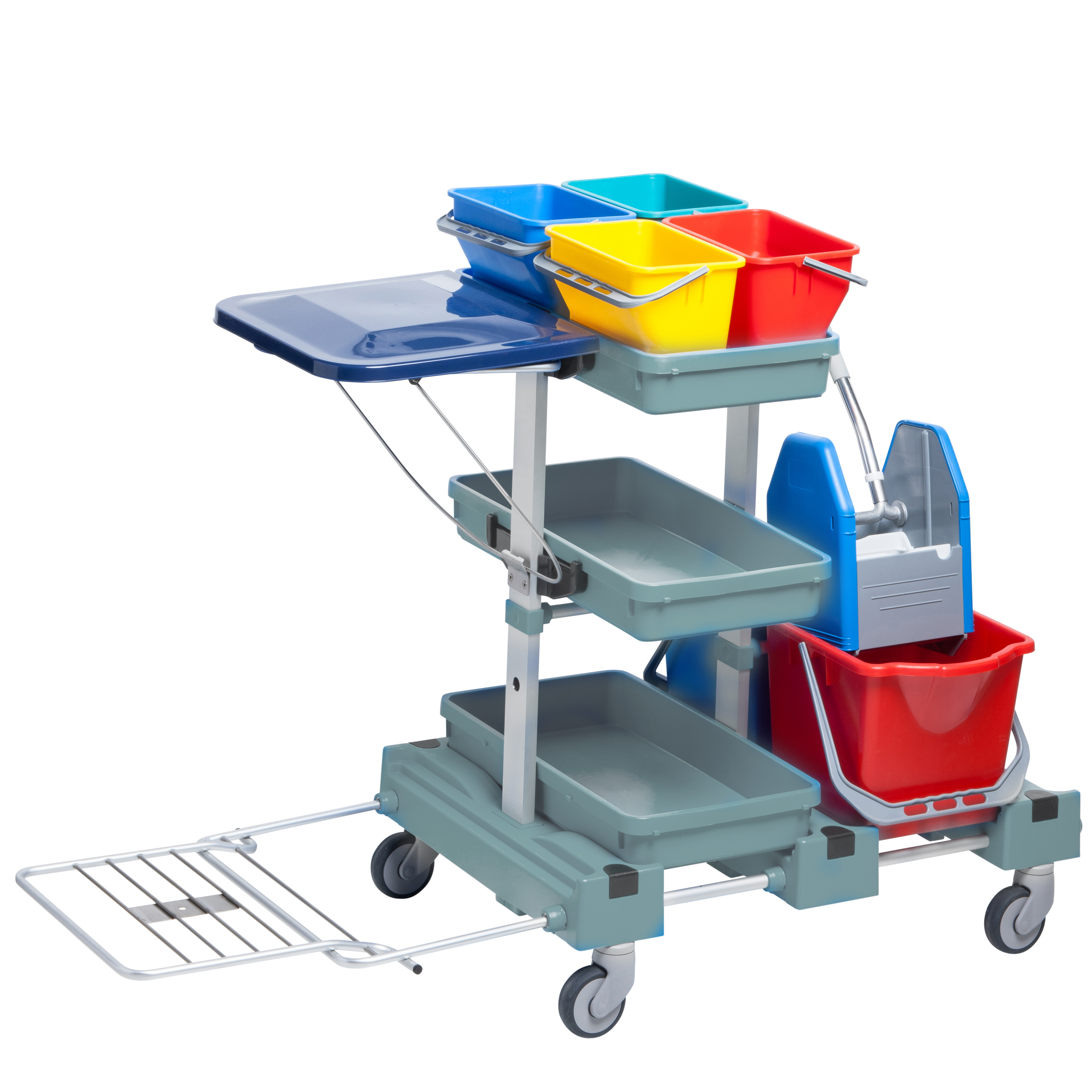 Composé de châssis (L117 x L 62 x H 98 cm) avec 4 roulettes pivotantes, 2 seaux de 18 litres rouge/bleu, presse plastique M2, 3 bacs en plastique, 4 porte-bacs, 4 seaux de 6 litres jaune/rouge/bleu/vert, porte-sacs à déchets avec grille