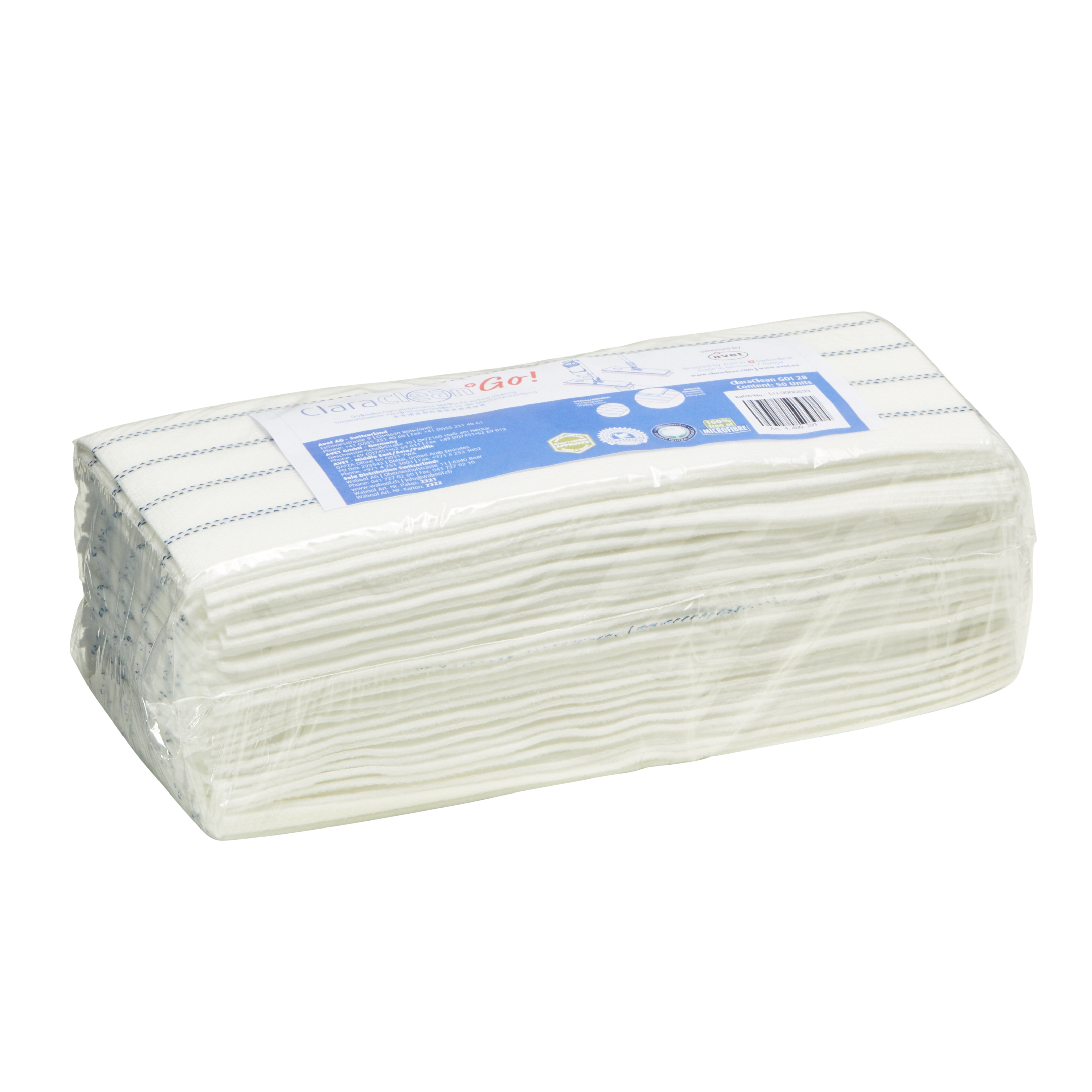 Blaues, mit alkalischem ClaraClean Tensid beladenes Einweg-Bodenreinigungstuch. Breite 28cm. ClaraClean Go! sind trockene, beladene Hochleistungstextilien für die Oberflächenreinigung im Einweg-System. Durch die Befeuchtung mit purem Wasser werden die Reinigungstenside aktiviert und können definiert abgegeben werden. Beutel à 50 Stück Karton à 12 Beutel