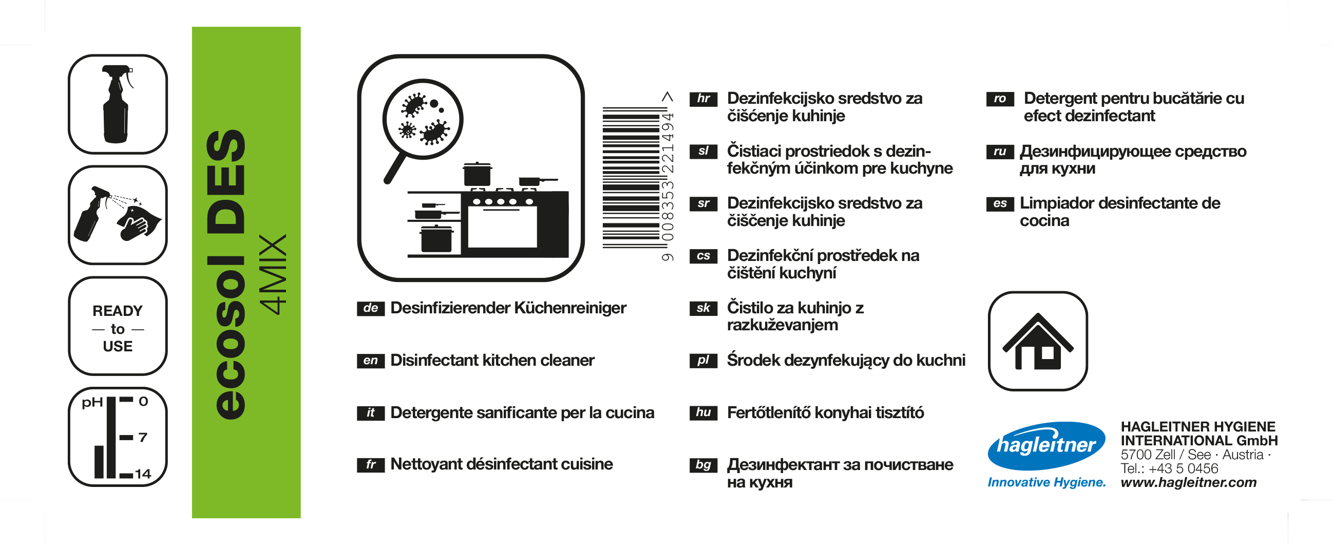 Hochkonzentrierter, desinfizierender Küchenreiniger. Reinigt und desinfiziert in nur einem Arbeitsschritt. Geprüft und begutachtet nach neuesten EN Richtlinien. Frei von QAV, daher ideal für die tägliche Anwendung in allen Bereichen der Lebensmittelzubereitung und deren Zubehör. Losen Grobschmutz entfernen. Produkt auf die Oberflächen auftragen und vollständig benetzten. Bei Oberflächen, die direkten Kontakt zu Lebensmittel haben, Produktreste nach der Einwirkzeit von 5 Minuten mit sauberem Wasser entfernen.