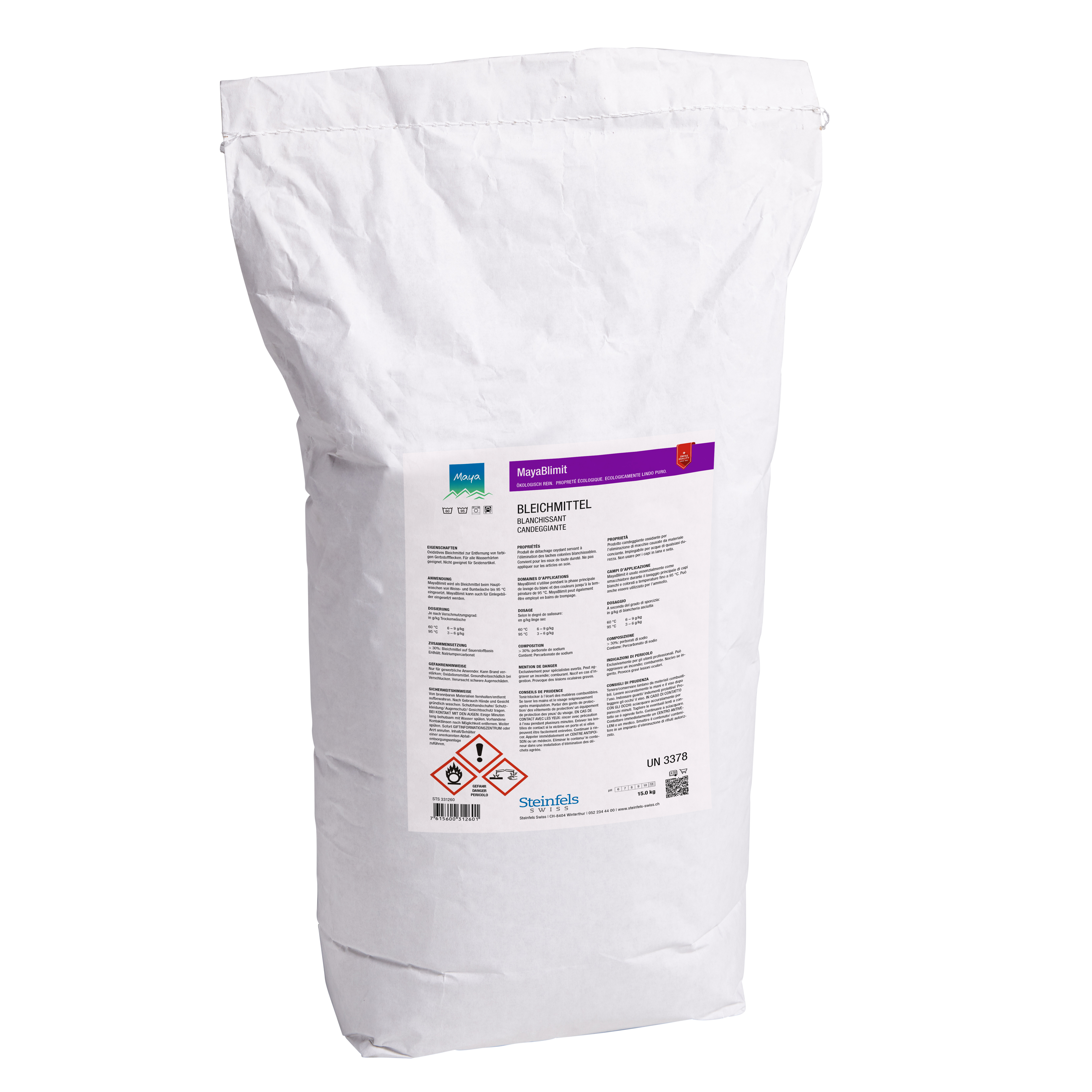 Pulverförmiges Bleich- und Fleckenentfernungsmittel für Weiss- und Buntwäsche, ab 60 °C.