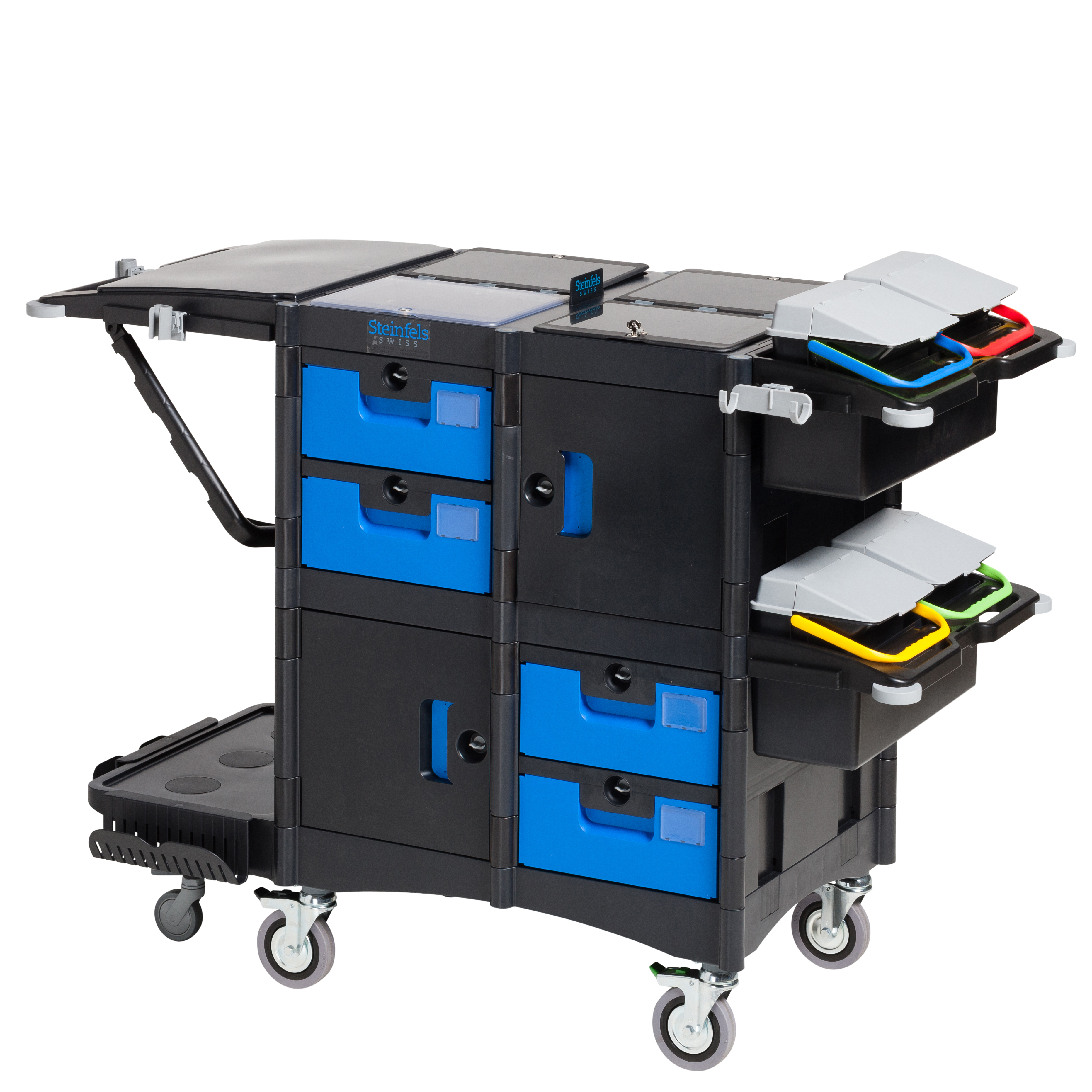 Der CleanMaster B1 Black is Green ist geeignet für sicherheitskritische Bereiche dank geschlossenem System. Die integrierten Schubladen garantieren einen hygienischen Transport der Textilien, genügend Platz finden Sie für den Transport für Materialien sowie für die Lagerung und den Rücktransport der benutzten Textilien.