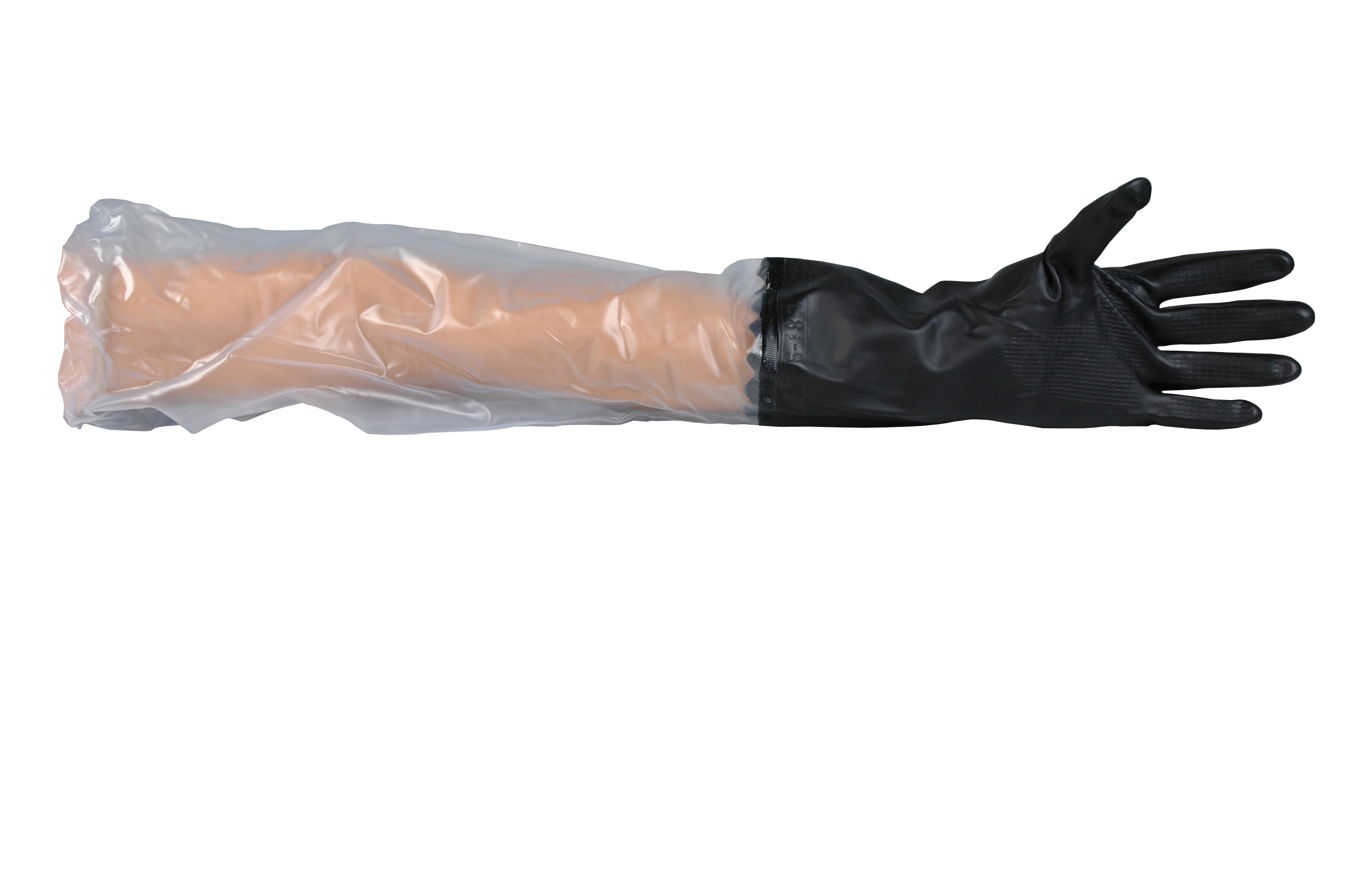 Industriehandschuh aus Vinyl, schwarz, angeschweisste Stulpe, Länge 75 cm.